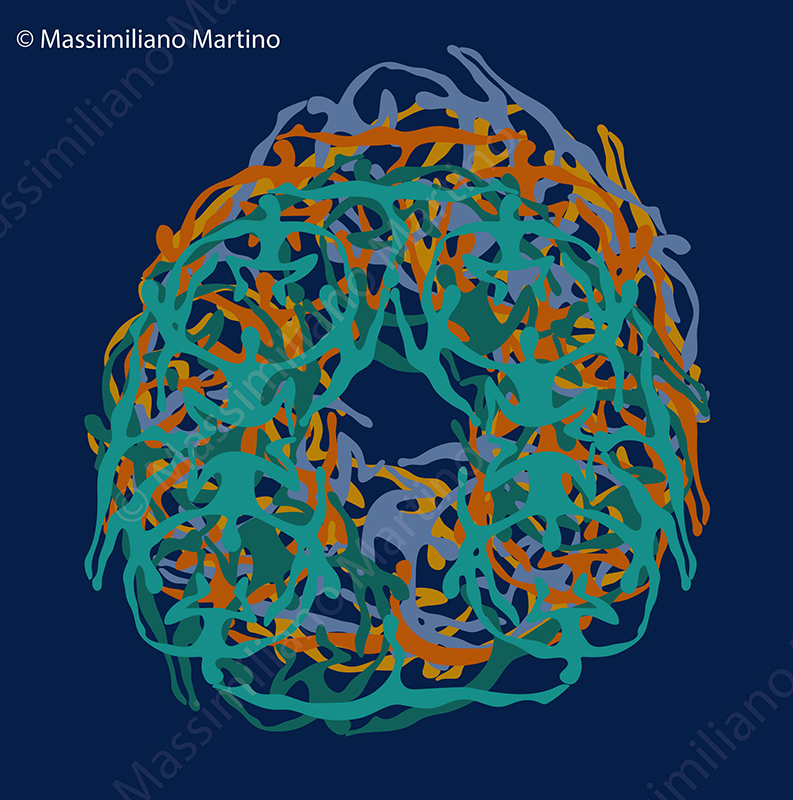 Dai girotondi di Matisse all’immenso blu dell’inconscio sinonimo di universo interiore, l’intreccio, l’osmosi universale delle origini, un armonia immaginata e il suo temperamento espresso in ritmica e movimento, una palpitazione cerebrale e cromatica. L’emotività espressa in danze di forme e colore alla ricerca di una mistura esistenziale sono il soggetto di un opera che ha voglia di presentarsi come un DNA rinnovato.