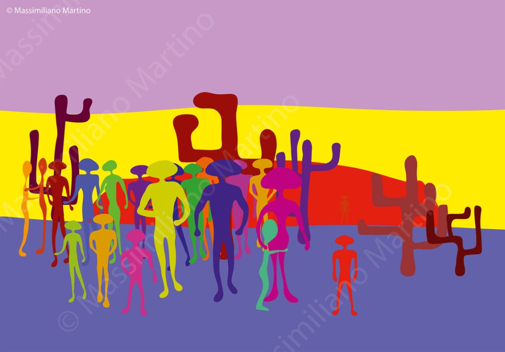 Uno scenario desertico che accoglie comunità, ispirazione di continenti, dal Saguaro americano sino all’Ayers Rock (Uluru), da occidente a oriente per una nuova rinascita, a determinare forze antiche, le vie dei canti, in questo caso affidate al colore oltre la visione, una preghiera in un epoca smarrita dallo spirituale, una società inclusiva si aggrega e cammina verso lo spettatore in un ambiente che unisce il pianeta e lo sensibilizza verso il problema climatico.